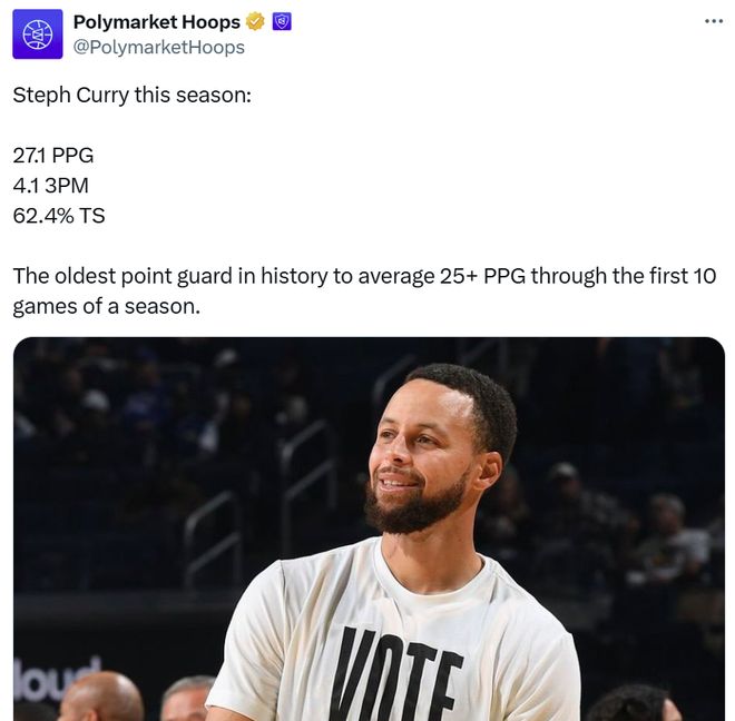 在本场比赛结束后,库里也将开季前10场比赛的场均得分提升至27.1分,这让37岁244天的库里成为NBA历史上开季前10场交出25+得分表现最老的控卫。