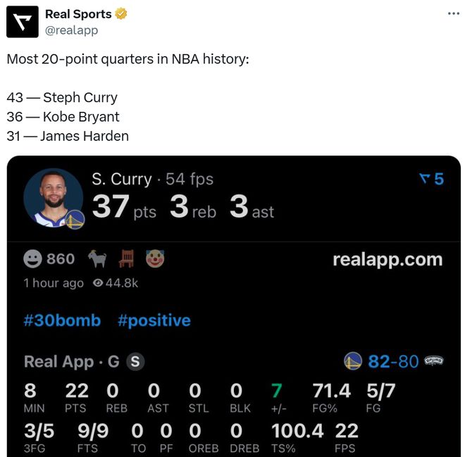 如果进一步将年龄要求提升至35岁,本场则是库里第6次交出40+,成功追平詹姆斯并列历史第一。
