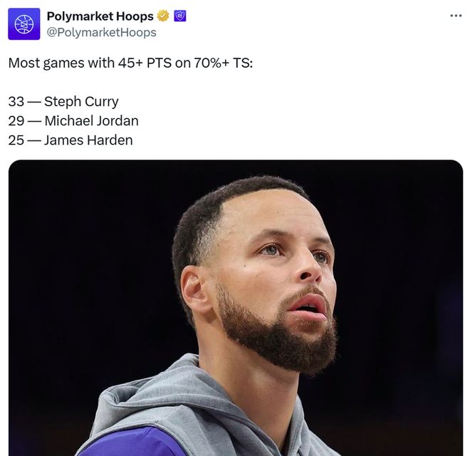 从效率角度衡量,库里同样是历史第一,本场是他生涯第33次在70%+真实命中率的情况下得到45+得分高居历史第一,乔丹29次第二,哈登25次第三。